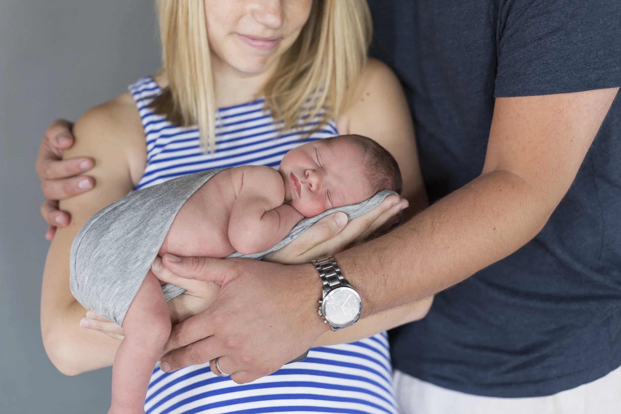 When Connor and Carlee walked into the studio with Lincoln, I’m pretty sure I squealed. Connor didn’t even get his jacket off before he said “you can’t wait any longer to hold him, can you?” Lincoln was the sweetest, cutest little peanut. I swear he must have been dreaming of rainbows and butterflies because he was content for our entire session. He let me adjust him with ease and mold him any way I’d like. As long as he was snuggled in tight, and kept warm, he was ready to model. His big ‘ole hands and feet had me in awe thinking of the big, kind boy he’d grow in to be.